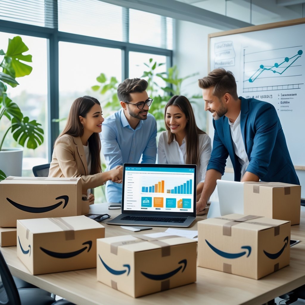 A group of diverse entrepreneurs collaborating in an office with product boxes and digital charts, planning their Amazon FBA business.